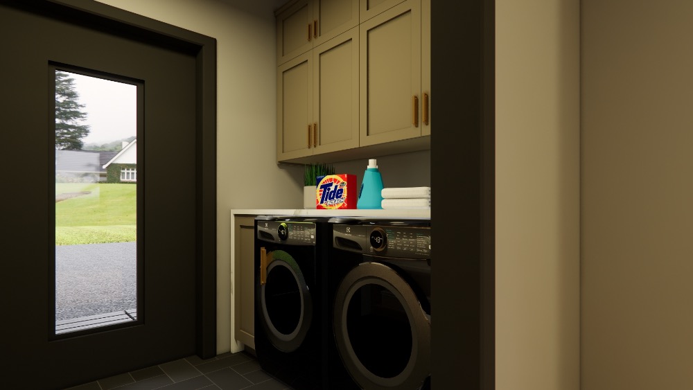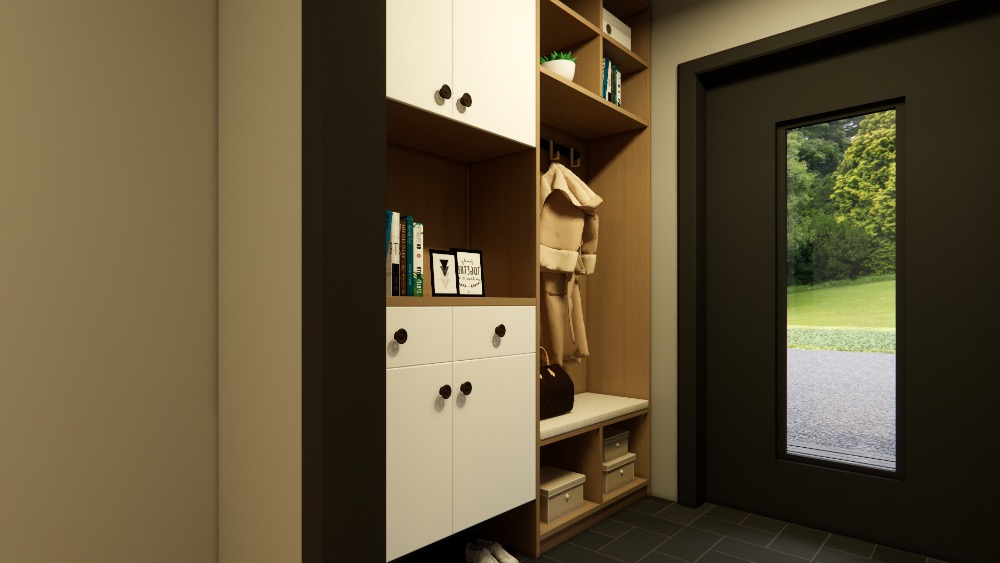 - Háztartási helyiség: mosógép, tárolók, technikai zóna
