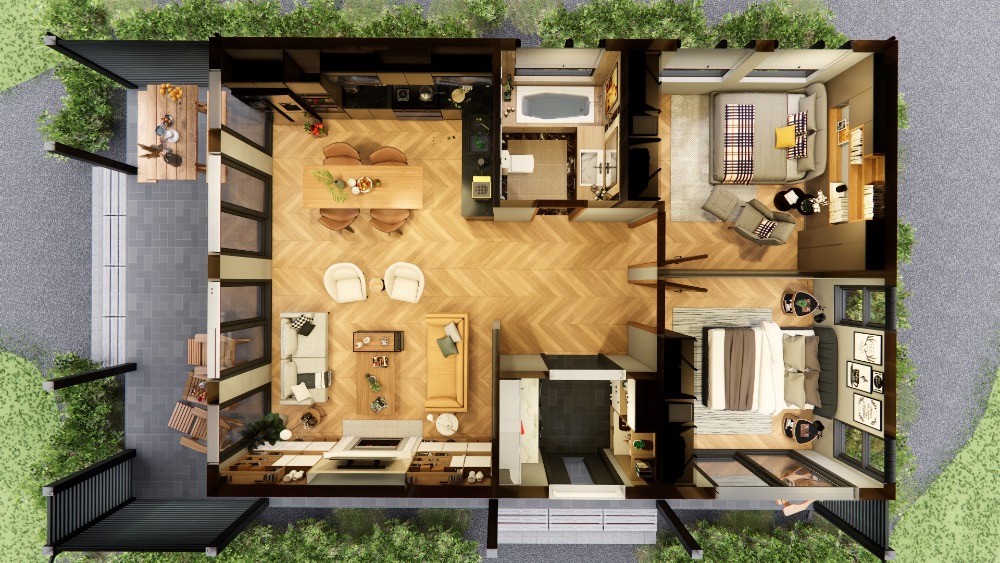 A CEDAR 100 m² + 25 m2 Terasz modulház a modern családi élet esszenciája: tágas terek, otthonos hangulat, letisztult skandináv formavilág és természetes fa melegség – mindez egy 4 évszakos, energiatakarékos otthonba csomagolva.