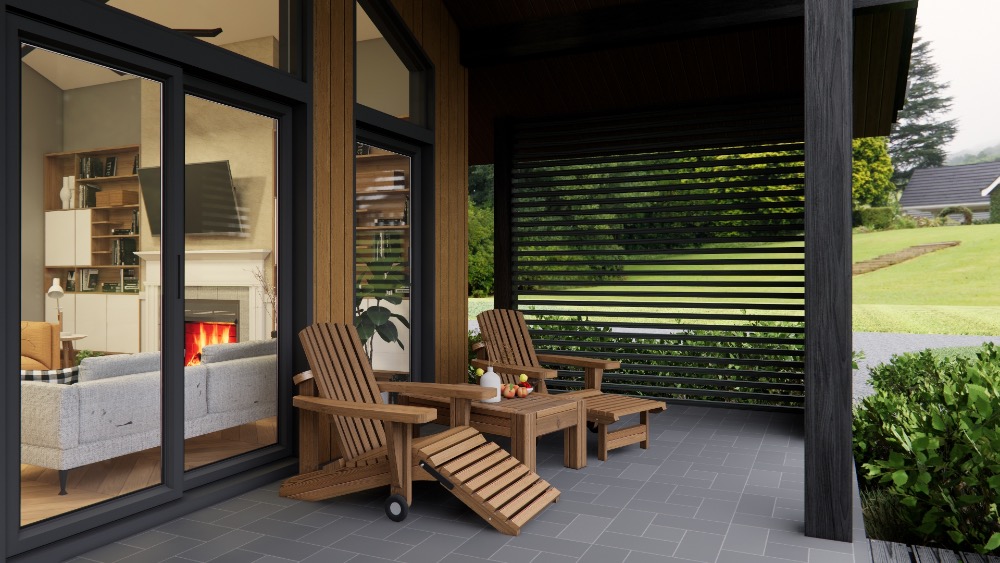 - Tető: modern fém/fedett panel vagy zsindelyes megoldás, rejtett vízelvezetés