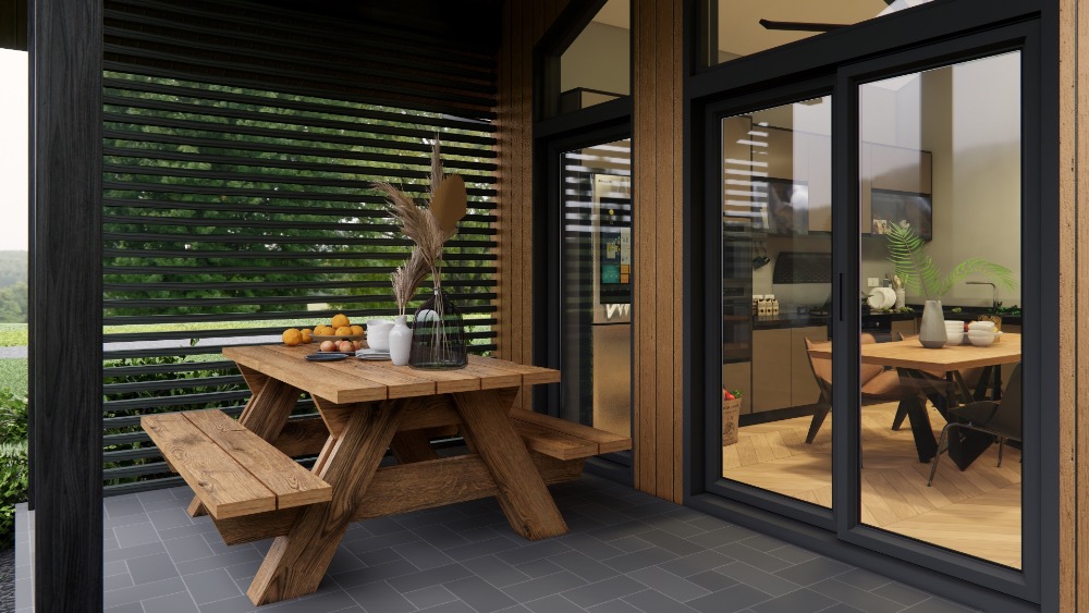 - Természetbe simuló design – fa homlokzat és sötét elemharmónia