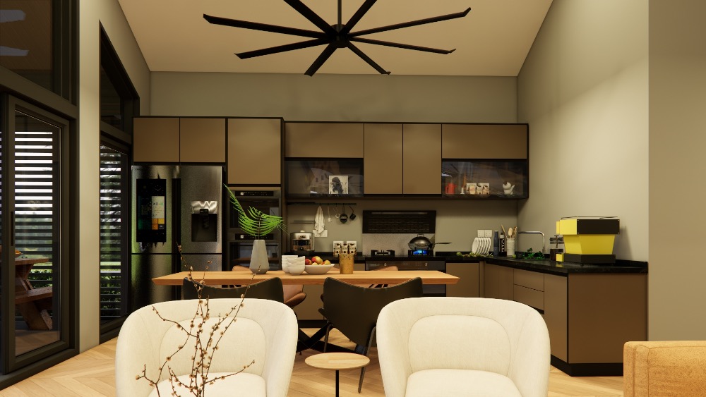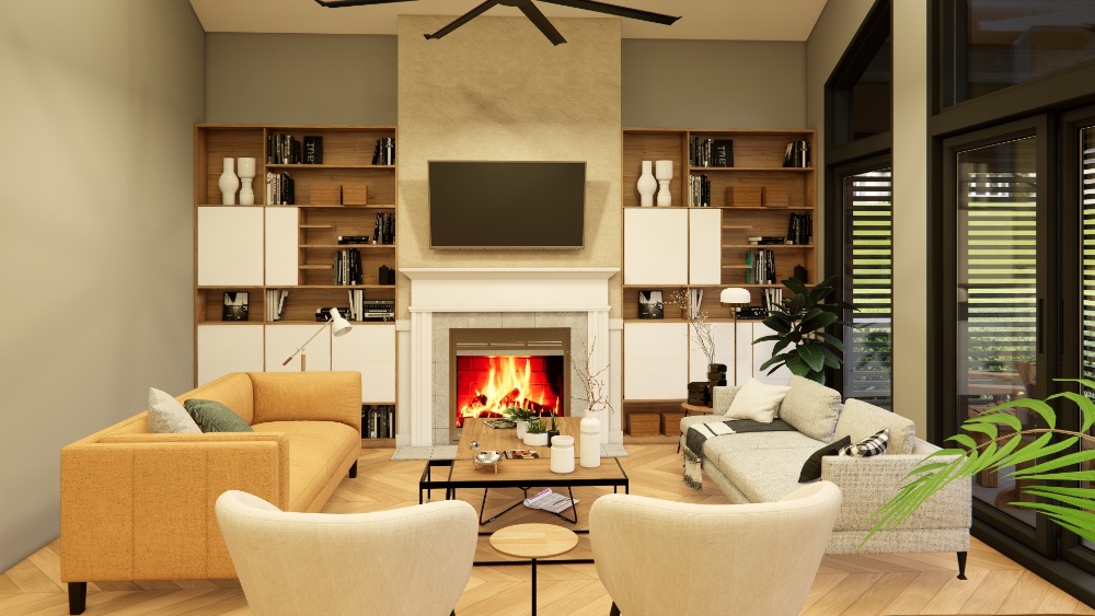 A nagy üvegfelületek fényárban úszó nappalit teremtenek, a fedett terasz pedig a nappali természetes meghosszabbításaként szolgál. Ideális azok számára, akik komfortos, időtálló és családbarát lakóteret keresnek – kompromisszumok nélkül.